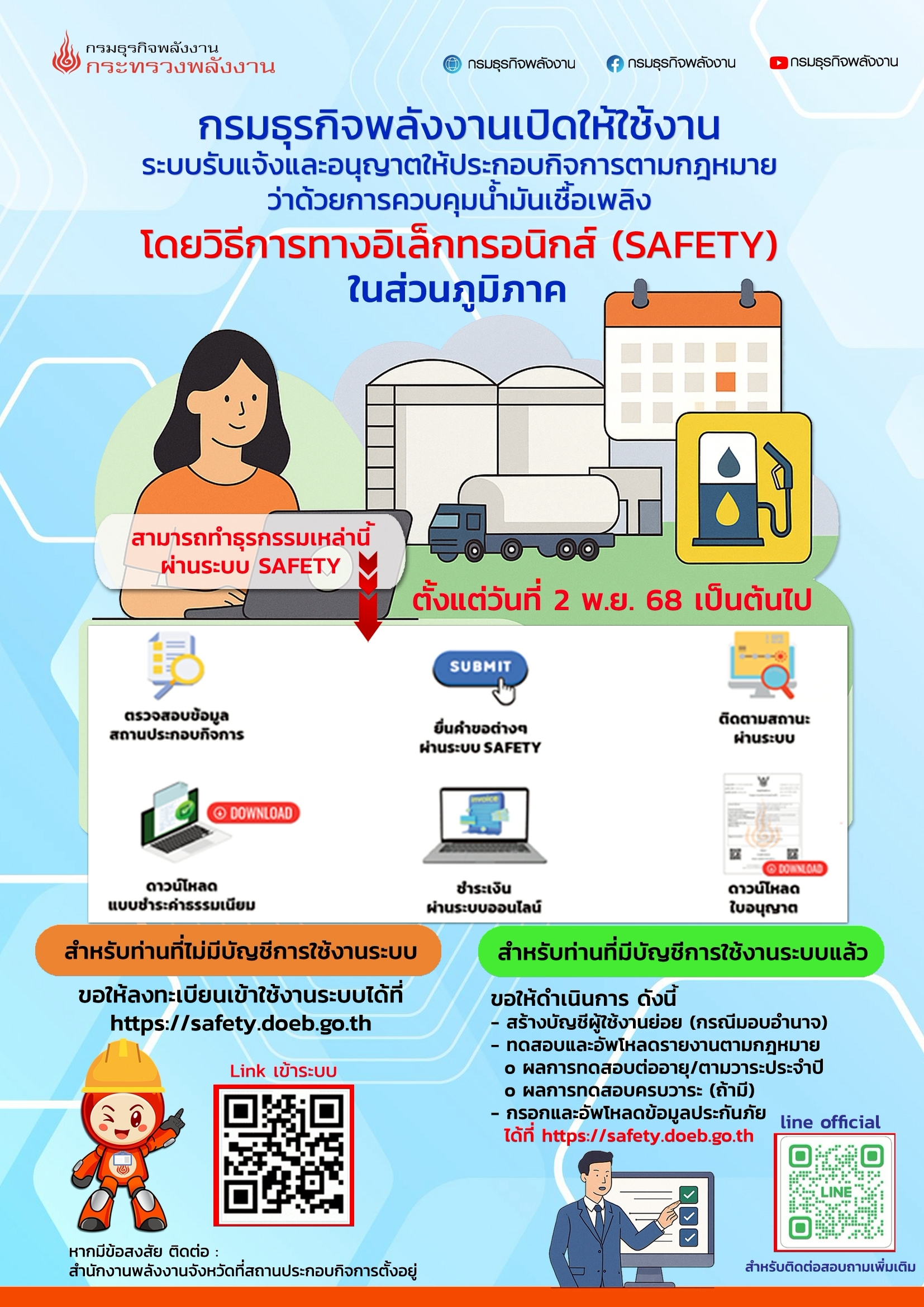 กรมธุรกิจพลังงานเปิดให้ใช้งานระบบรับแจ้งและอนุญาตให้ประกอบกิจการตามกฎหมายว่าด้วยการควบคุมน้ำมันเชื้อเพลิง โดยวิธีการทางอิเล็กทรอนิกส์ (SAFETY) ในส่วนภูมิภาค โดยผู้ประกอบที่ยังไม่มีบัญชีการใช้งานระบบ สามารถลงทะเบียนเข้าใช้งานระบบได้ที่ https://safety.doeb.go.th สำหรับผู้ประกอบการที่มีบัญชีการใช้งานระบบแล้ว ขอให้ดำเนินการตามขั้นตอนที่กรมธุรกิจพลังงานแจ้งรายละเอียดตามเอกสารประชาสัมพันธ์ที่แนบมาพร้อมนี้
